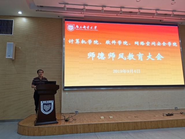 季小健书记首先传达了教育部发布的“《教育部关于高校教师师德失范行为处理的指导意见》教师〔2018〕17号”和江苏省教育厅发布的“《省教育厅关于印发教师师德失范行为处理实施细则的通知》苏教规〔2019〕1号”两个文件精神;重点解读了《江苏省高校教师师德失范行为处理办法(试行)》中有关师德师风失范行为的具体表现和师德失范行为的处理及处理结果的运用等。最后,他要求,各系中心、部门和教师党支部要将学习《江苏省高校教师师德失范行为处理办法(试行)》摆上重要日程,纳入本学期教职工政治理论学习计划,认真组织教职工学习领会和全面掌握该《办法(试行)》的主要内容,进一步规范我院教职工履职履责行为,恪守《新时代教师职业行为十项准则》,落实立德树人根本任务,弘扬新时代高校教师道德风尚,杜绝师德失范行为的发生;要求每位教职工务必强化师德意识,自觉按照习近平总书记对广大教师提出的“四个引路人”、“四个相统一”的期望和要求,做有理想信念、有道德情操、有扎实学识、有仁爱之心的“四有”好教师。