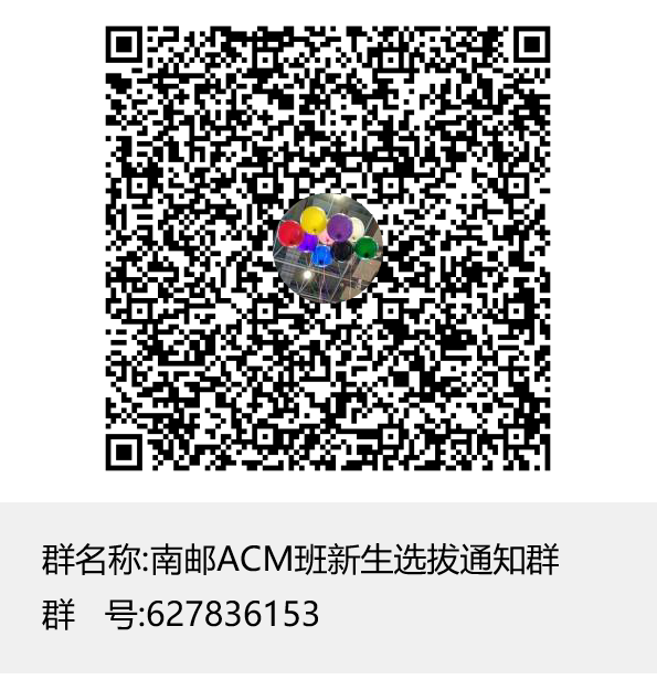 咨询联系电话18351895685;联系邮箱acm@njupt.edu.cn;选拔通知QQ627836153微信公众号南邮ACM;通知发布网站https://cs.njupt.edu.cn/jxdt/