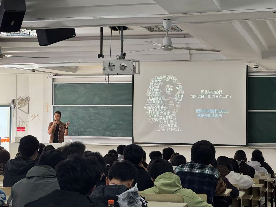 讲座伊始,李岳聪经理从“认识自我”切入,引导同学们围绕兴趣、能力、价值观进行自我剖析,并用“职业选择关键因素图谱”进行可视化梳理:成长与挑战、专业匹配与技术栈、平台与发展空间、薪酬与福利、稳定性与城市选择、社会价值与自我实现等多维度权衡。他抛出“即将毕业的我,如何选择一份适合的工作?”的核心问题,并强调:“预测未来最好的方式,就是去创造未来!”鼓励同学们以主动实践创造机会、以成果沉淀提升竞争力。