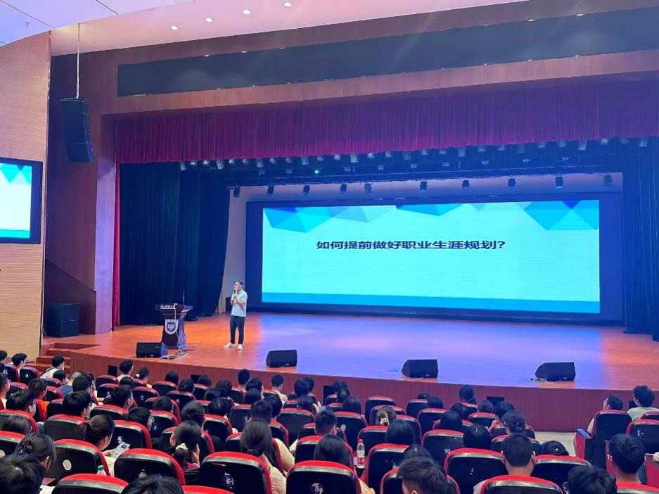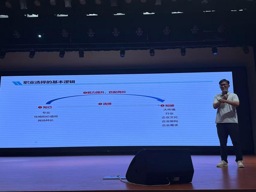 讲座中,刘文旭总监以“职业选择的基本逻辑”四步法为主线,系统拆解从校园走向职场的关键环节:①知己——准确认识自身的专业基础、性格与价值观以及其他特长;②知彼——洞察宏观环境与行业走势,理解企业文化、组织架构与用人需求;③选择——在“知己—知彼”的基础上完成方向定位与路径规划;④能力提升、匹配岗位——以阶段性目标驱动技能闭环,实现与目标岗位的高水平匹配。这一框架帮助新生打通“认知—行动—成长”的闭环,打破校园与职场之间的信息壁垒。