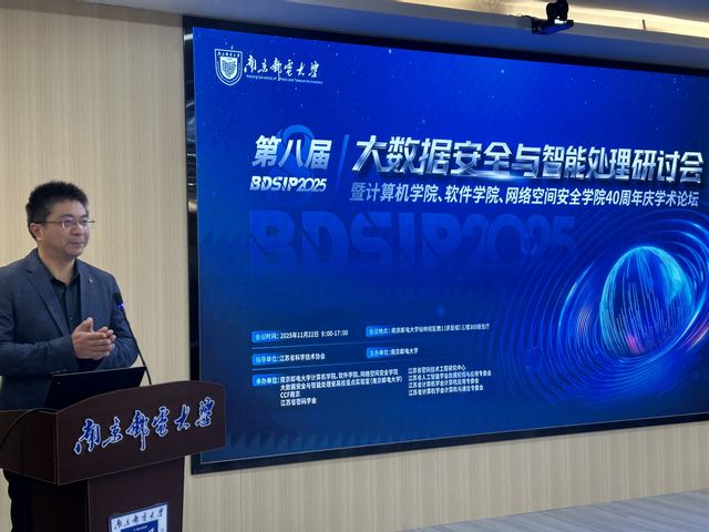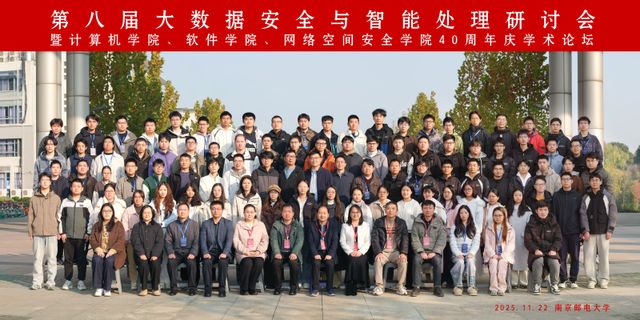 2025年11月22日,第八届大数据安全与智能处理研讨会(BDSIP2025)暨计算机学院、软件学院、网络空间安全学院40周年庆学术论坛在南京邮电大学仙林校区成功举办。本次论坛由江苏省科学技术协会指导,南京邮电大学主办,南京邮电大学计算机学院、软件学院、网络空间安全学院、大数据安全与智能处理江苏省高校重点实验室、CCF南京、江苏省密码学会、江苏省密码技术工程研究中心、江苏省人工智能学会数据挖掘与应用专委会、江苏省计算机学会计算机应用专委会、江苏省计算机学会计算机与通信专委会等多个单位共同承办,来自省内外高校的百余位专家学者及师生齐聚一堂,共襄盛会。