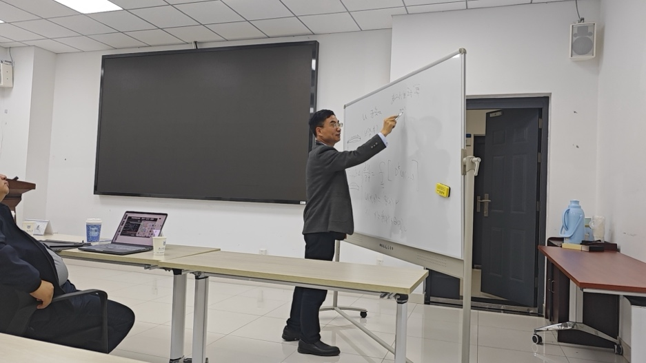 随后,肖亮教授作了题为《模型与数据驱动学习优化的研究谱系与遥感信息处理》的学术报告。在报告中,肖教授重点强调了“AI的理性回归:数学模型与数据驱动”的学术观点。报告期间,会议室显示屏突发故障断电,肖亮教授随即转用白板,现场为师生手推相关的数学公式。他以扎实的数理功底和严谨求实的治学态度,保障了学术分享的顺利进行,展现了纯粹的学术探讨氛围。