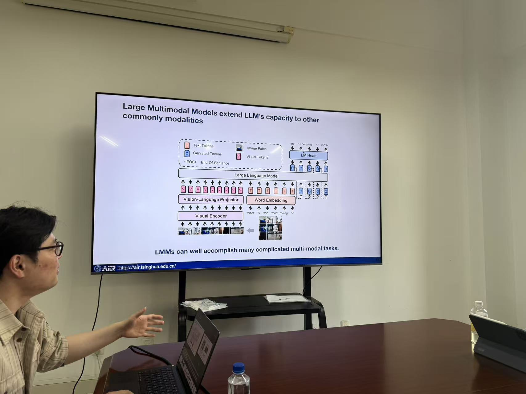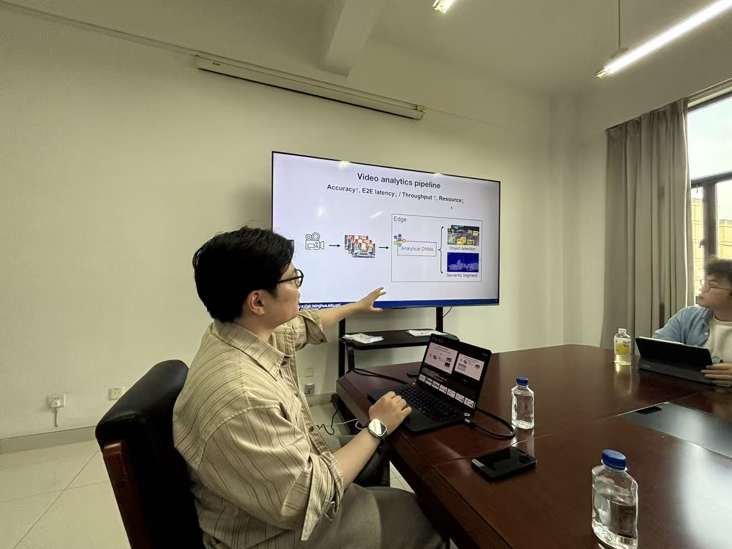本次报告围绕资源受限边缘设备上的高效智能模型部署展开,王蔚峻老师介绍了团队在边缘人工智能系统方面的最新研究进展。报告指出,随着实时智能应用快速发展,如何在带宽、算力和存储受限条件下实现人工智能模型的高效部署,已成为边缘智能领域的重要问题。报告重点介绍了三项研究工作:一是NSDI 2025 的区域化内容增强方法,通过选择性增强视频关键区域,在带宽受限条件下提升视觉分析精度;二是 EuroSys 2025 的基于 LoRA 的大规模多模态模型边缘部署方法,实现了边缘设备上的高效视觉理解;三是正在投稿 SIGCOMM 的 KVFetcher 工作,通过优化 KV Cache 管理机制,加速大语言模型推理过程。报告展示了团队在边缘视频分析、多模态模型部署和大模型推理加速等方向的研究成果。报告结束后,现场师生围绕边缘智能系统设计与大模型高效部署等问题进行了深入交流。